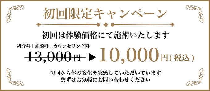 | 不妊整体(初回お試し料金・カウンセリング含) ※最終施術日より1か月経過後、再診料加算) | 公式HP割引 初診料無料 | 10,000円 |