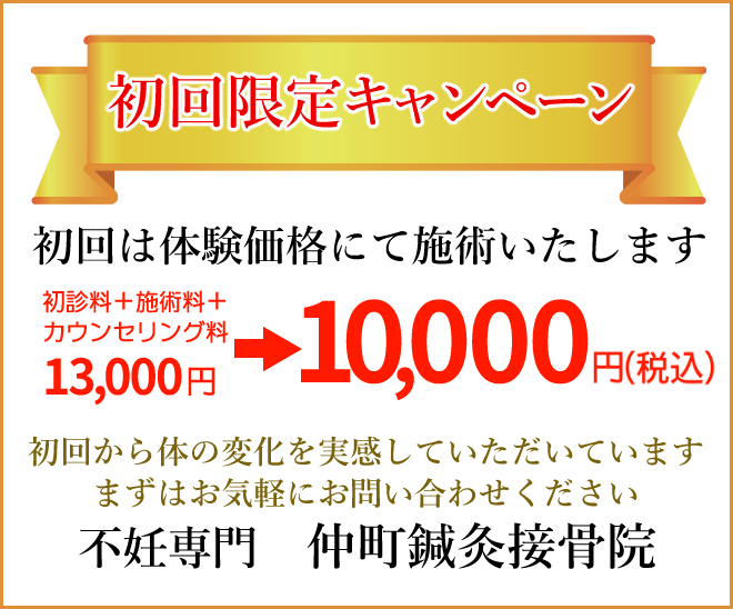 | 不妊整体(初回お試し料金・カウンセリング含) ※最終施術日より1か月経過後、再診料加算) | 公式HP割引 初診料無料 | 10,000円 |