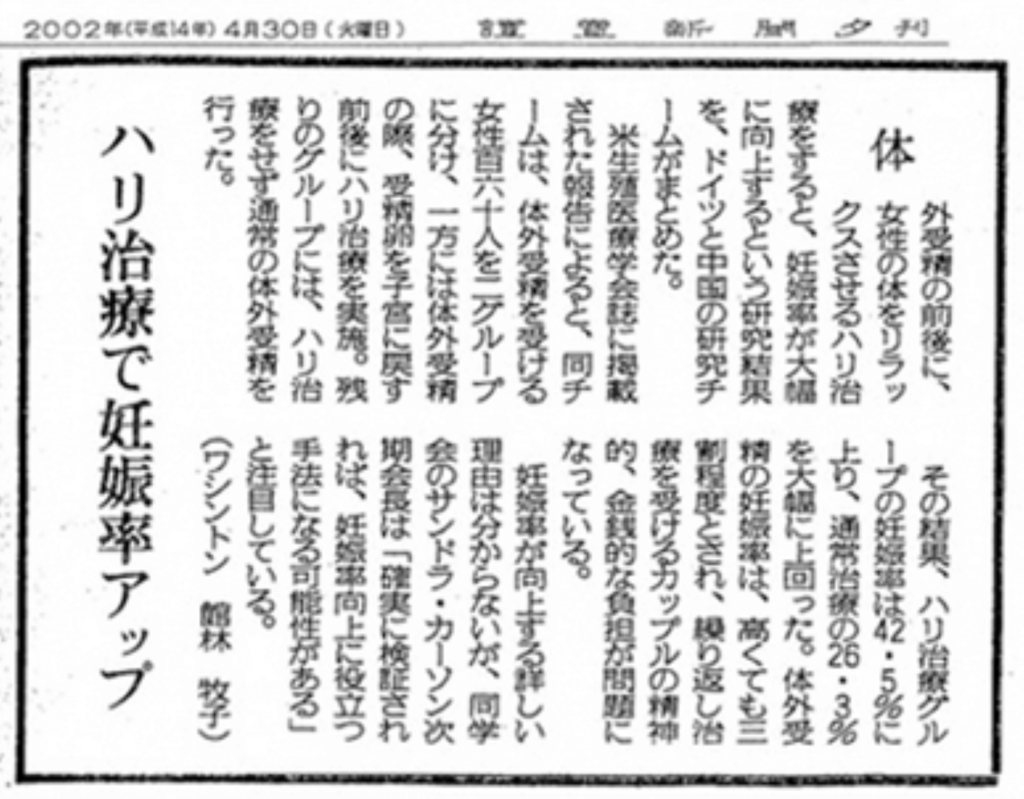 不妊鍼灸で妊娠率向上(読売新聞2002年4月30日夕刊)